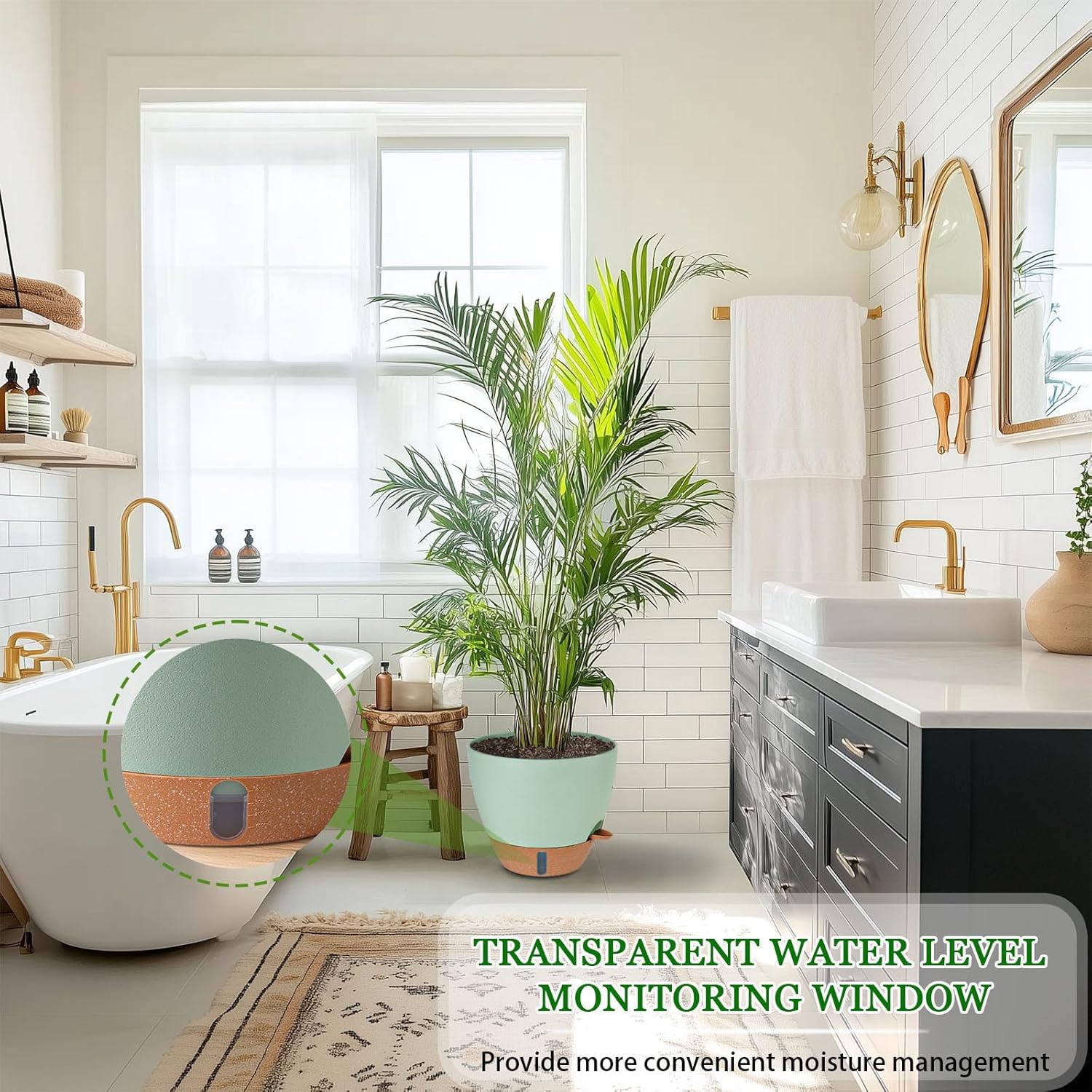 - đż ăSelf-Watering Pots with Water Level Indicatoră Designed for busy plant lovers, our 8/10/12 self-watering pots feature a built-in ABSORBENT COTTON WICK SYSTEM that automatically draws water from the detachable bottom tray. The TRANSPARENT WATER LEVEL WINDOW WITH MEASUREMENT MARKINGS lets you monitor hydration at a glance, ensuring no overwatering or underwatering. Perfect for indoor/outdoor plants, this system keeps soil evenly moist for up to 7-10 daysâideal for vacations or hectic schedules.