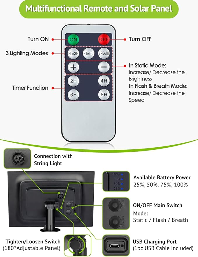 - Dimmable String Lights with Versatile Lighting Options: Our solar dimmable lights offer 3 different modes (Static/ Flash/Breath) and 10 level dimming/speed adjusting options(0%-100%) controlled by the included remote. The 4 levels timer (2H/4H/ 6H/ 8H) allows you to set the lights to turn off automatically, save the hassle of manually turning off the lights. You can add a touch of playfulness to your backyard by choosing different light modes that twinkle like stars or fireflies