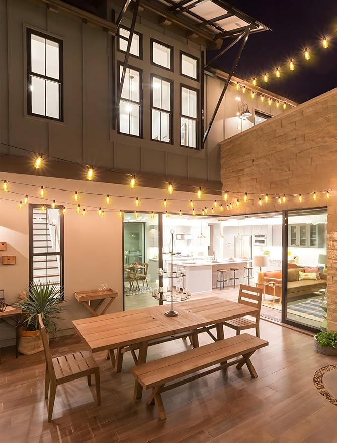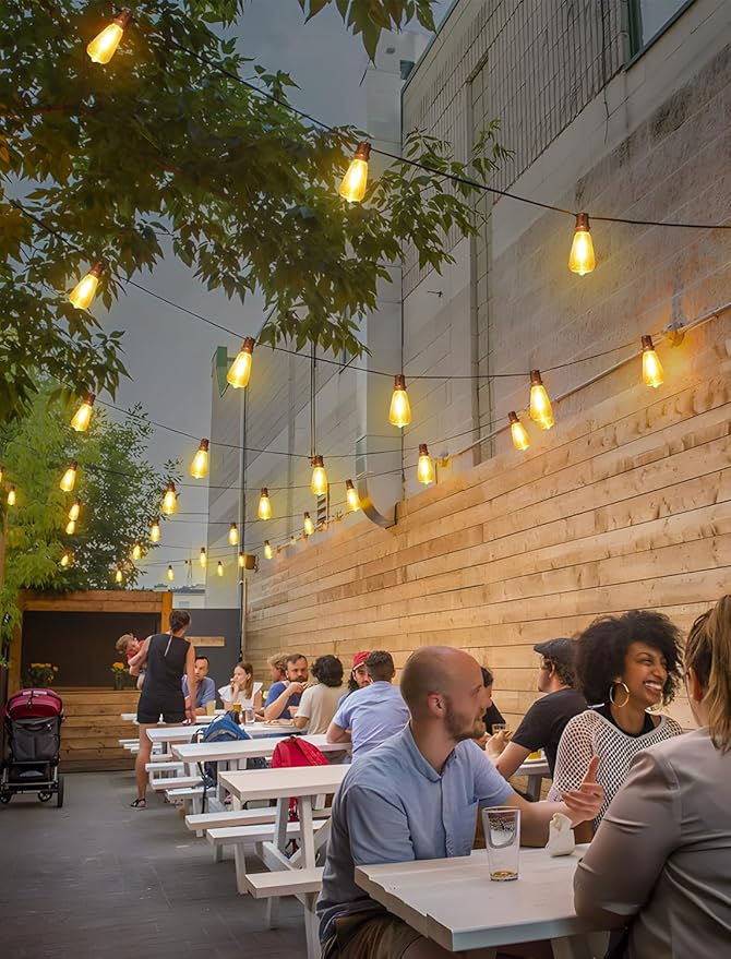 - 3 Pack 48FT Solar Patio Lights with Remote: Larkvue dusk to dawn 2700K warm white solar lights transform your outdoor space, with 54 hanging sockets 54 ST38 clear bulbs( bulb spacing is 2.46FT), 3 spare bulbs, provide a soft and inviting glow, perfect for relaxing evenings or entertaining guests. Within 16FT range, you can easily use the remote to turn the string light on/off, adjust light modes and brightness levels. Featuring a memory function, these lights will remember your last mode setting