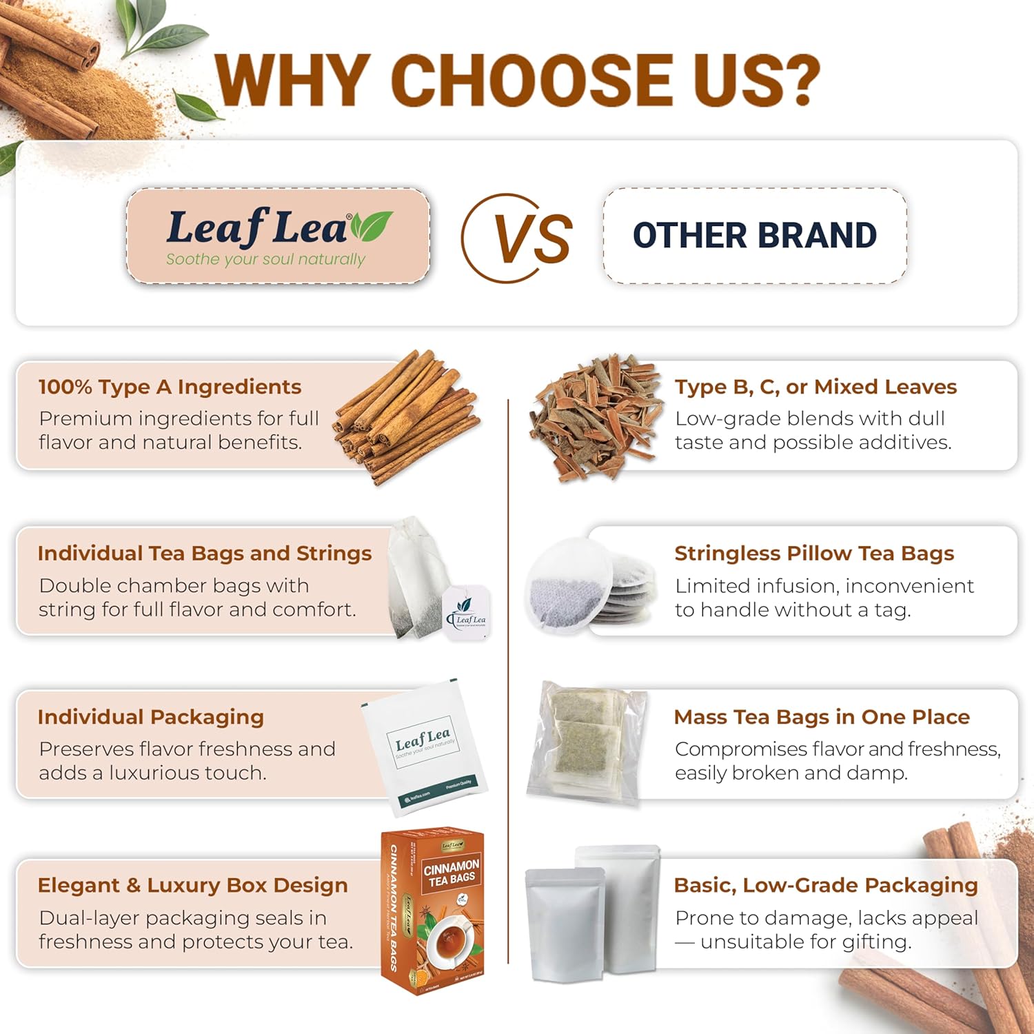- Pure Cinnamon Tea For Everyday Enjoyment: Made from finely ground cinnamon sticks, LeafLea Cinnamon Tea delivers a naturally spiced and aromatic flavor. Carefully crafted with no additives, for a relaxing experience
