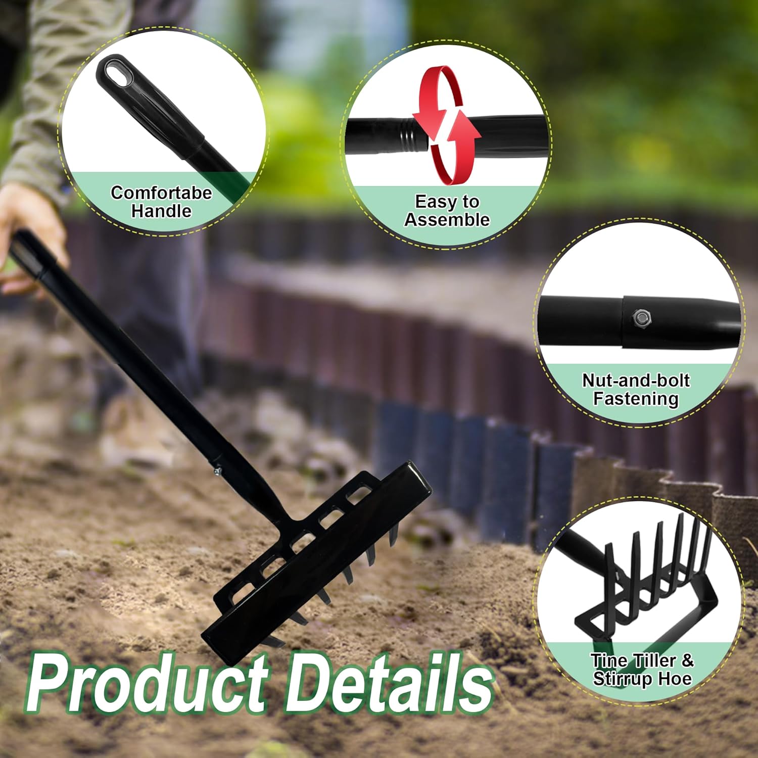 - 【Sturdy and Well-Made】Garden hula hoes tiller rake cultivator tool with stainless steel metal includes 4 connecting tubes, and a 2-in-1 head. Really sturdy and well made. It's not heavy, it's lightweight but not flimsy at all. A small hole in the handle end allows you to hang it after use. Gloves are included to avoid sweaty hands, blisters or scratches from long hours of labor. Great gardening gift for parents, wives, husbands, friends, and coworkers who love gardening!