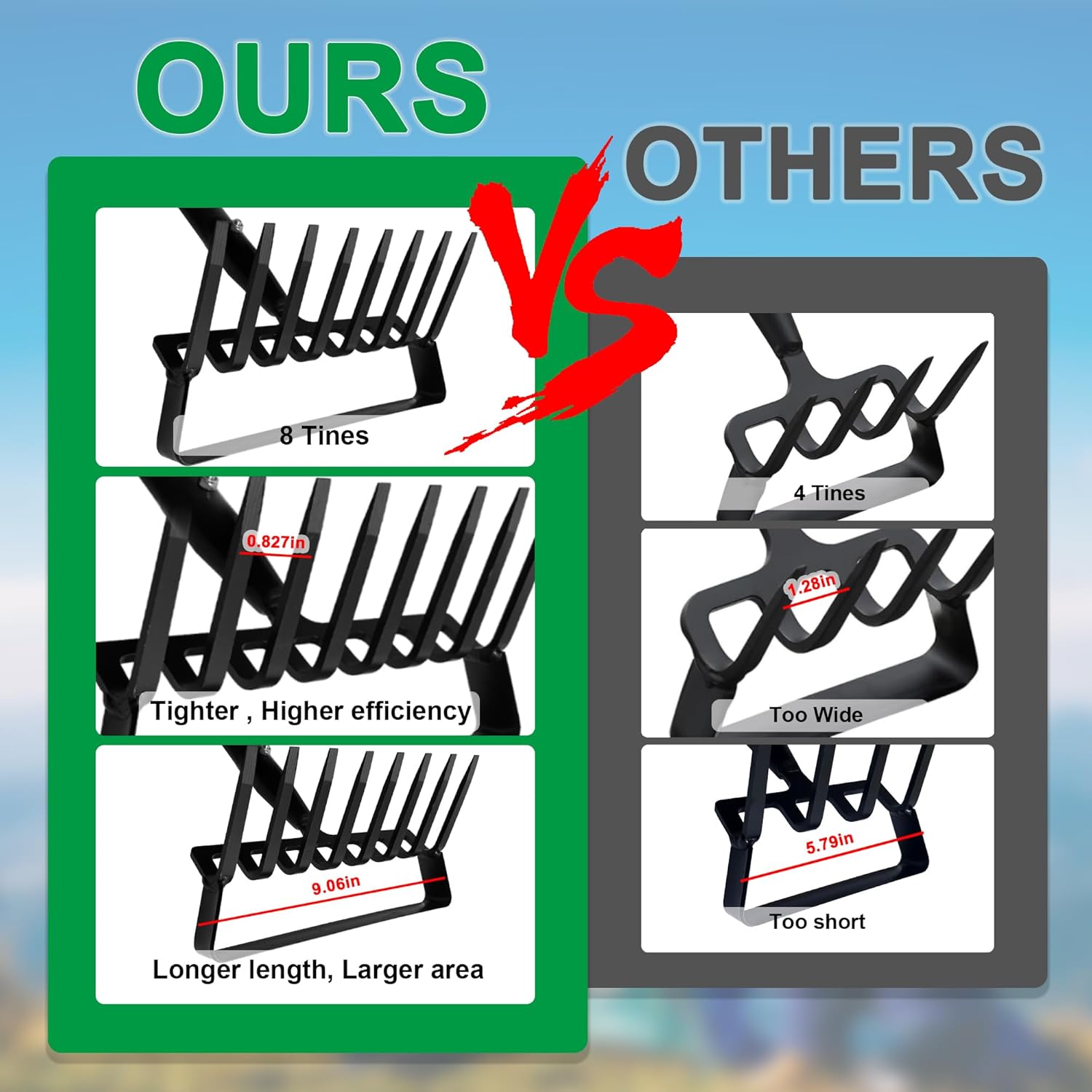 - 【6Tines/8Tines Available】We offer 6 tines and 8 tines metal rake. Compared to 4 tines, the tines spacing is smaller and tighter. It won't fail to remove debris because the tines are too wide apart. The hoe is also longer for more efficient weeding. Garden hoe and rake will easily go through most soil types to dislodge weeds. 2-in-1 yard rake and hula hoe is a great tool for gardening tasks such as weeding, digging, and loosening soil.