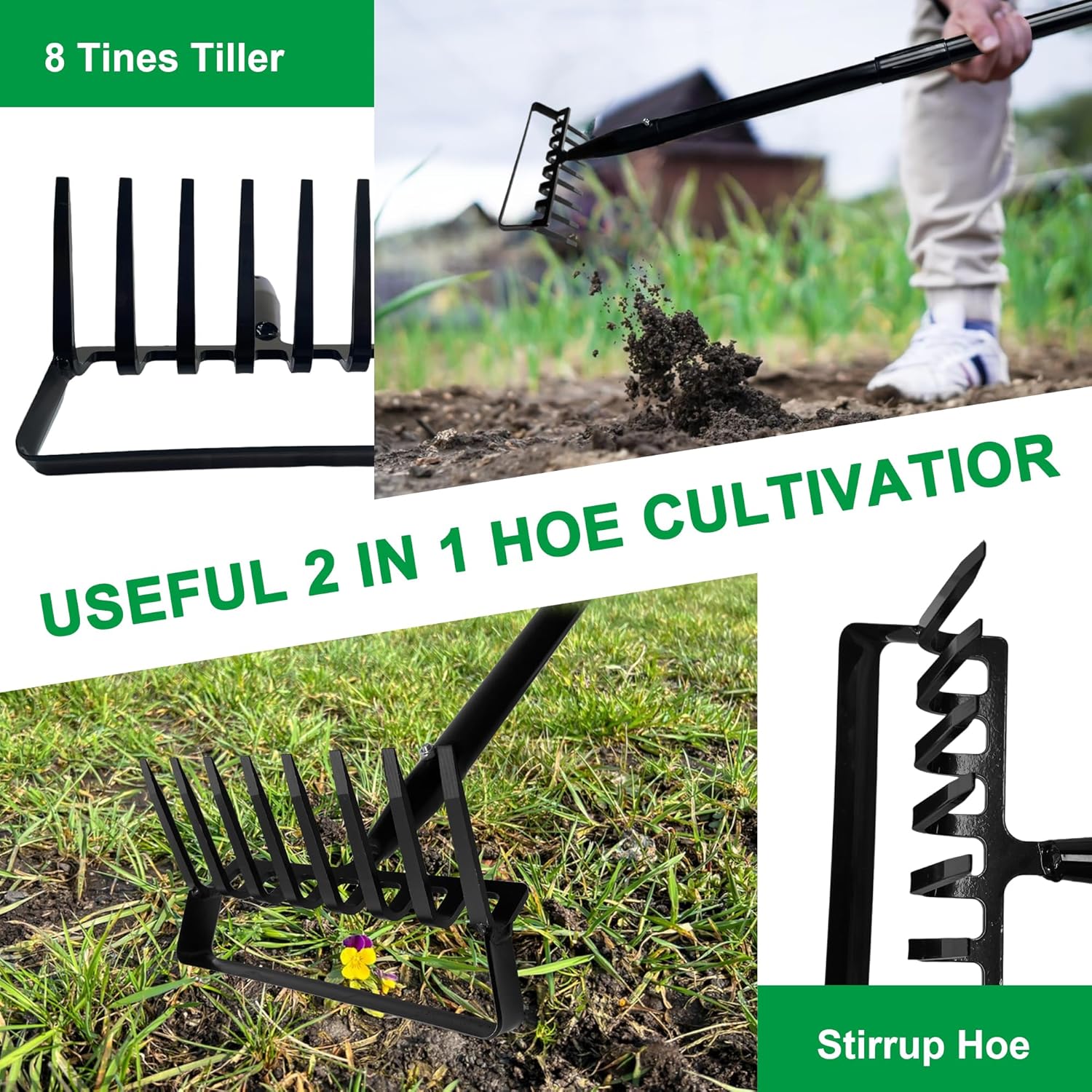 8-Tines Rake and Stirrup Hoe, Metal Garden Hula Hoes Tiller Rake Tool with Adjustable Long Handle, Action Scuffle Loop Hoe for Weeding, Digging, Loosening Soil