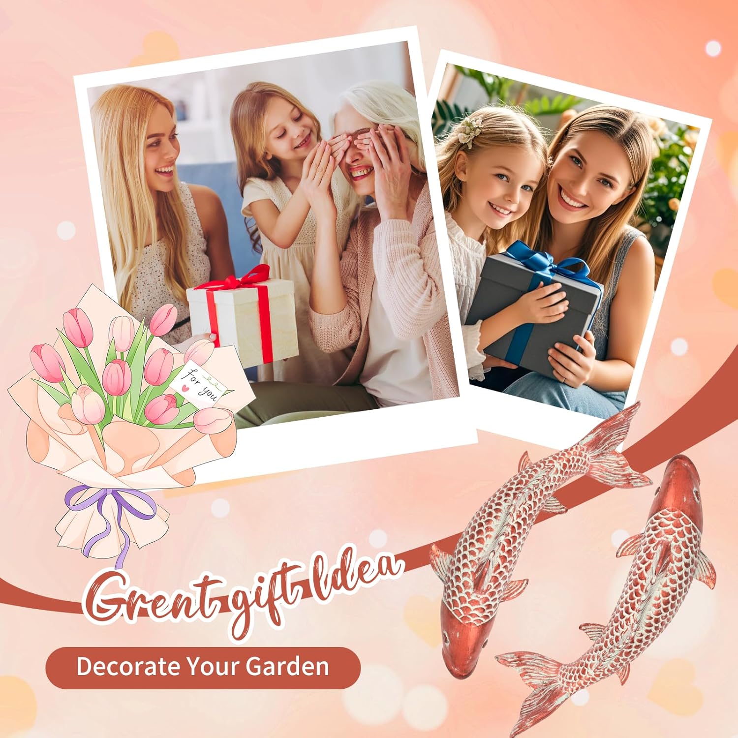 - Our koi fish garden decor Sculptures are carefully handcrafted by skilled artisans. The fish scales are made into strips and then stacked to create a 3D effect, making the statue look more prominent. The statue is hollow, so it is lightweight and easy to display.