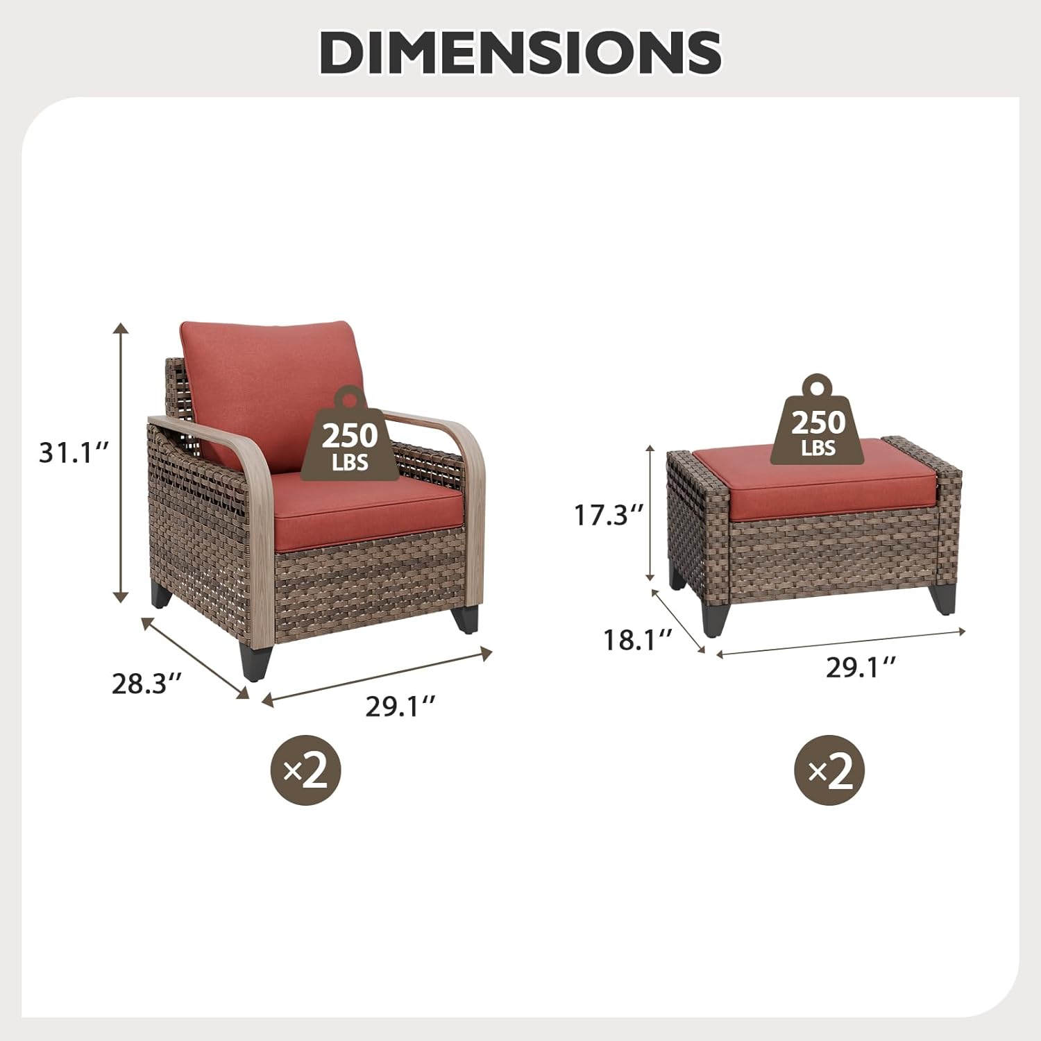 EAGLE PEAK Modern Wicker Outdoor Chair, Patio Chair Curved Armrest, Rattan Patio Furniture for Yard Deck Porch Garden, 2 Chairs 2 Ottomans, 4 Pieces, Brown/Red