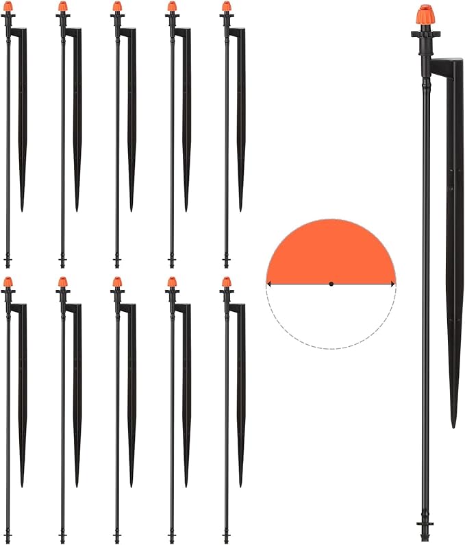 - Package Contents: The package includes 10 drip spray emitters mounted on 12-inch stakes, ready for installation. Each emitter is equipped with a stake for easy placement and stability in your garden. Additional 16" length 1/4" tubing is also provided to ensure you have everything needed for a complete irrigation setup