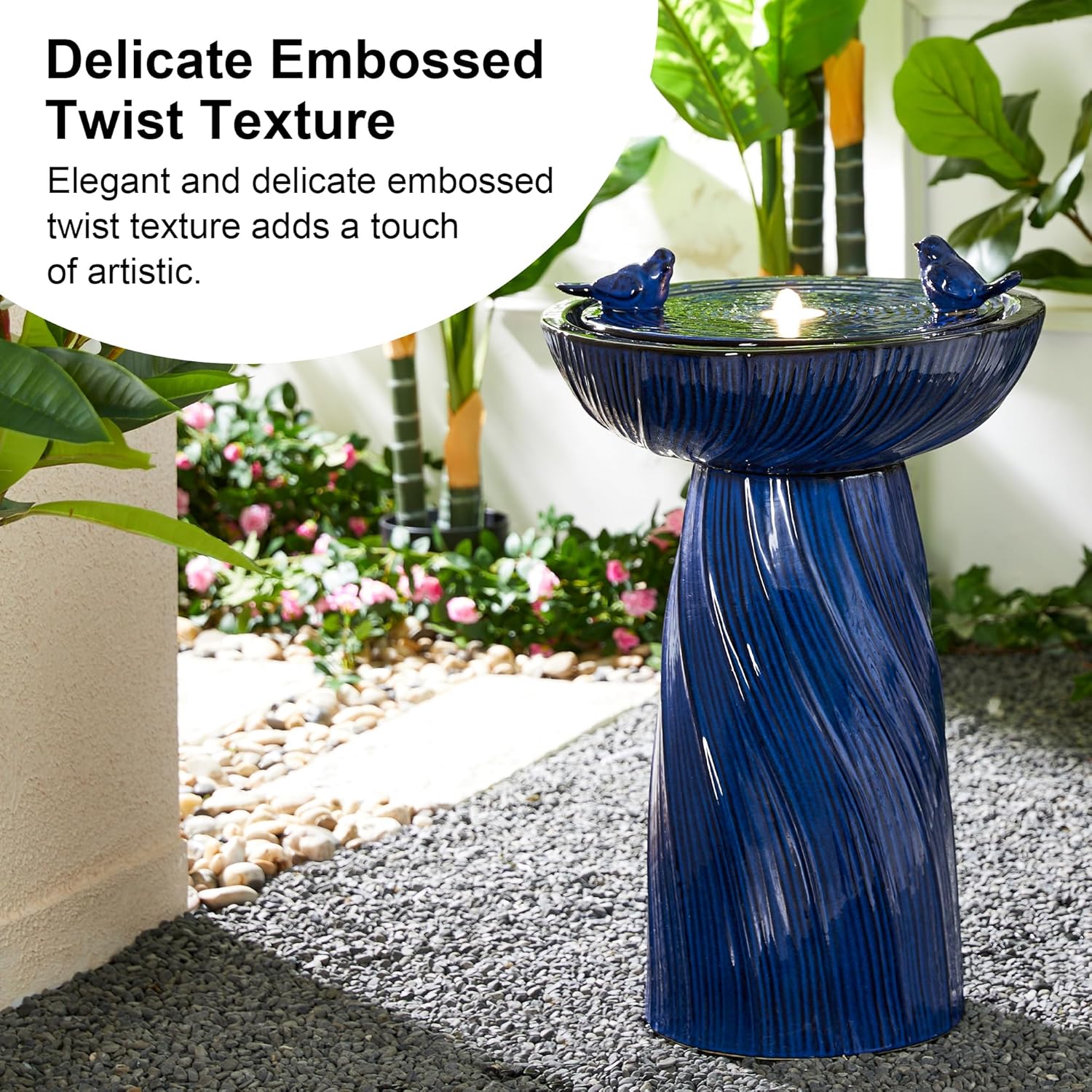 Glitzhome 24.75" H Outdoor Water Fountain with LED Light, Cobalt Blue Two Birds Twist Textured Floor-Standing Fountains, Ceramic Embossed Pattern Pedestal Water Fountain for Yard Patio Backyard