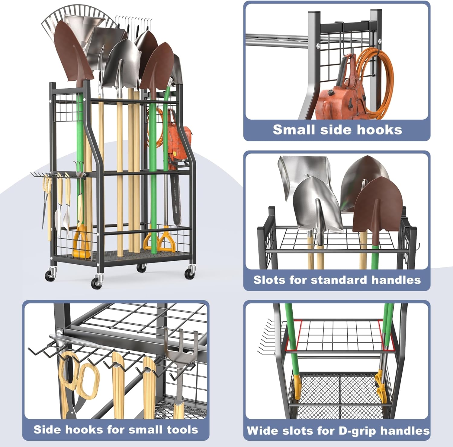 - Easy to Access: Ideal for garages, sheds, and gardens, this movable yard tool stand allows tools to be accessed from all sides, providing quicker and more convenient access during gardening tasks