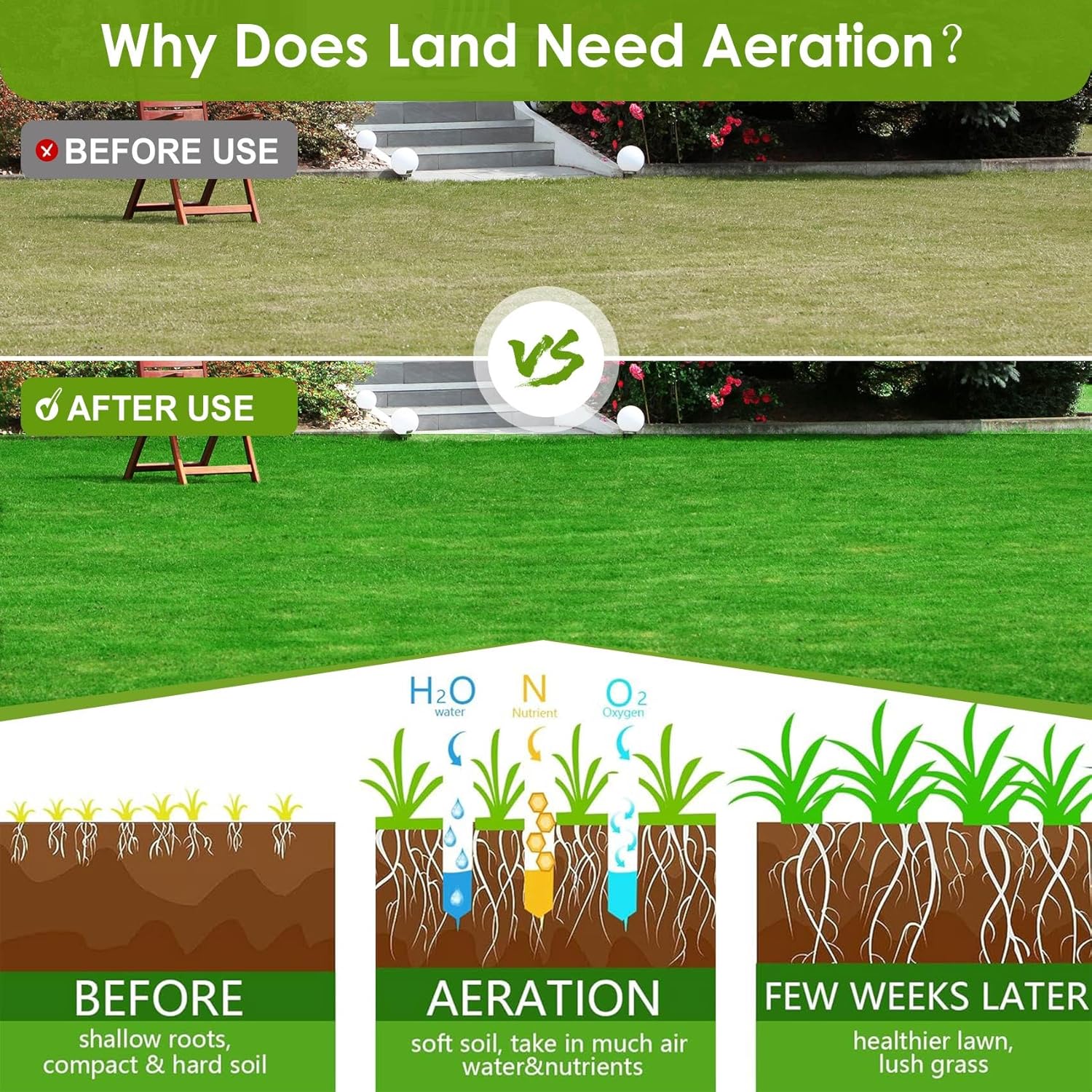 - 【Applicable Scene】Plant roots need air, water and nutrients to grow thick, deep and strong. When soil becomes compacted, even slightly, it inhibits the flow of the essentials that support thicker, healthier lawn growth. This calls for a lawn aerator to help replenish the nutrients your lawn and other plants need