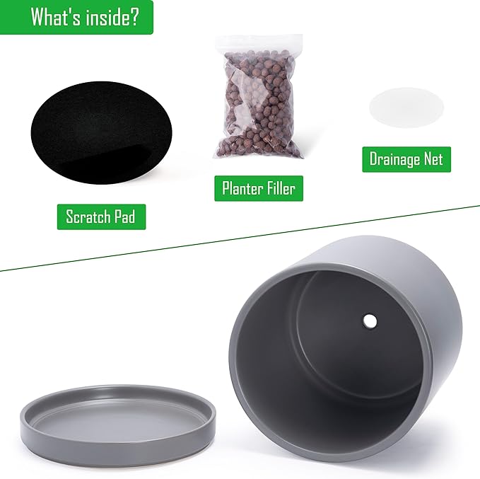 - Planter pot with drainage hole, mesh drainage net and protective scratch pad included.