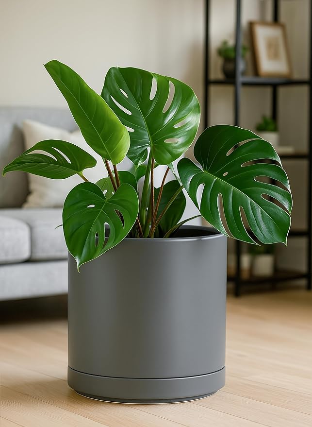- Simple, elegant, and modern cylindrical straight round planter pot with saucer and drainage hole.