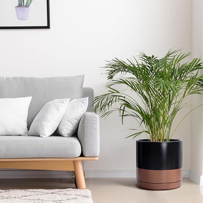 D'vine Dev 12 Inch Ceramic Planter Pot with Drainage Hole and Saucer, Indoor Cylinder Round Planter Pot, Black/Speckled Tan, 94-O-F-7