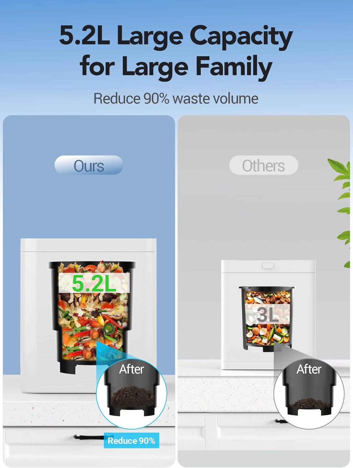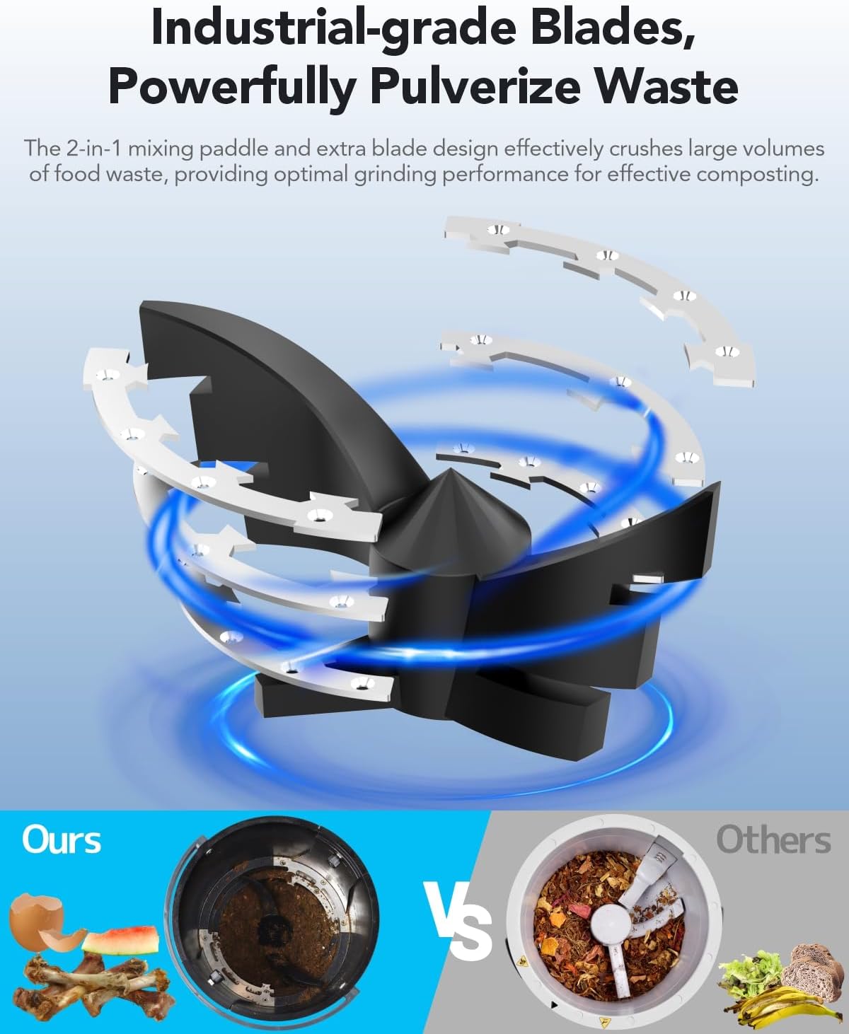 - 5.2L Large-Capacity Composter with Heavy-Duty Blades: Designed with a 5.2L large-capacity inner barrel, this compost machine meets the daily kitchen waste disposal needs of an entire family. And the extra stainless steel blades inside powerfully pulverize waste, easily handles tough food waste like eggshells, peels, chicken bones - no chunks, no clogging.