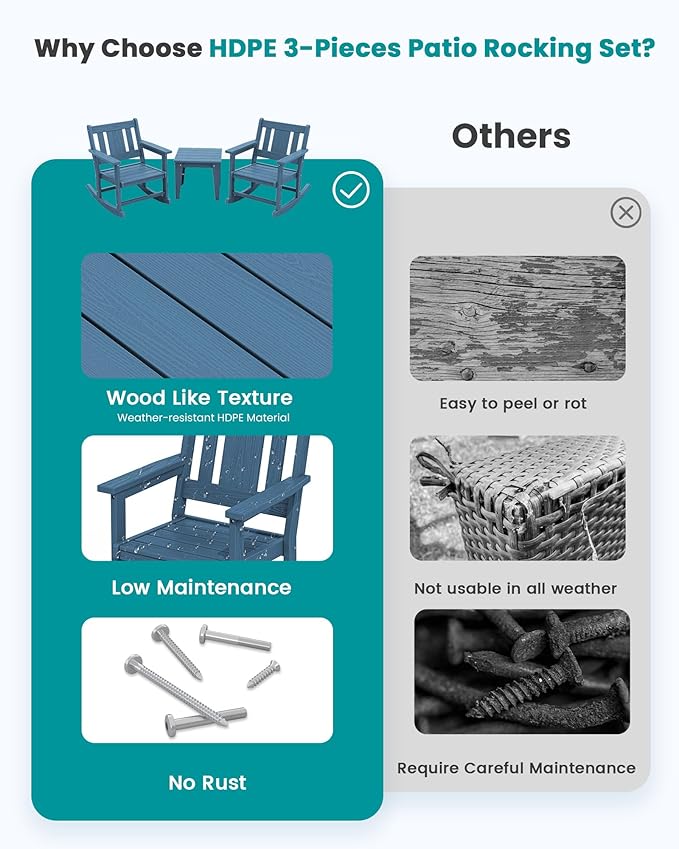 - All-Weather Use: Designed for outdoor living, this 3 piece rocking patio furniture set is designed to withstand all types of weather, including hot sun and cold winters. HDPE material will not fade, crack, peel or rot even when exposed to the natural environment. This ensures that our patio rocking chairs and coffee table will last for many years.