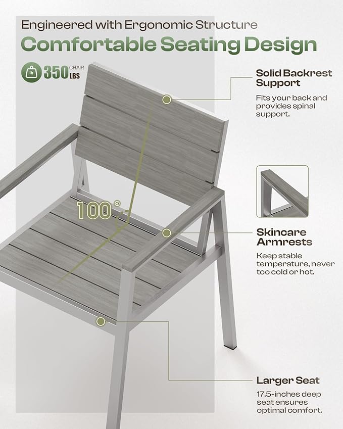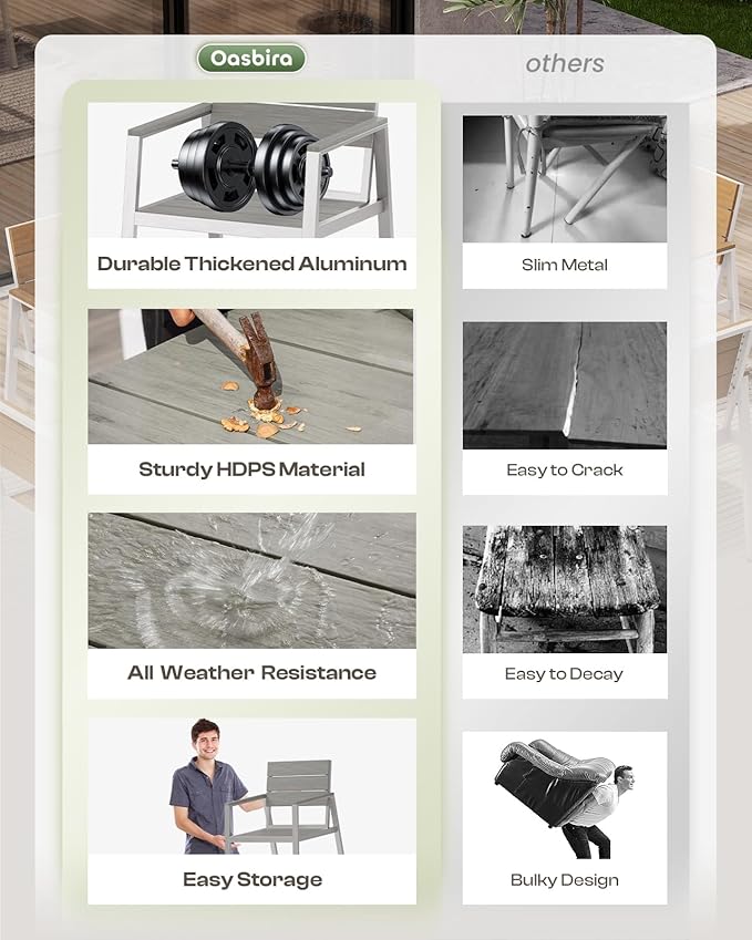 - Premium Material: This outdoor table and chairs set is crafted with high-quality aluminum frame and HDPS material. The aluminum frame features a double-layer design, engineered for exceptional stability and load-bearing capacity. The HDPS tabletop offers a natural wood-like finish, combining elegance with durability and weather resistance
