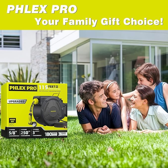 Retractable Garden Hose Reel 5/8 in x 115 ft Heavy Duty Automatic Water Hose Reel Wall Mounted with 10 Pattern Nozzle,Any Length Lock, Slow Return System, 180°Swivel Bracket