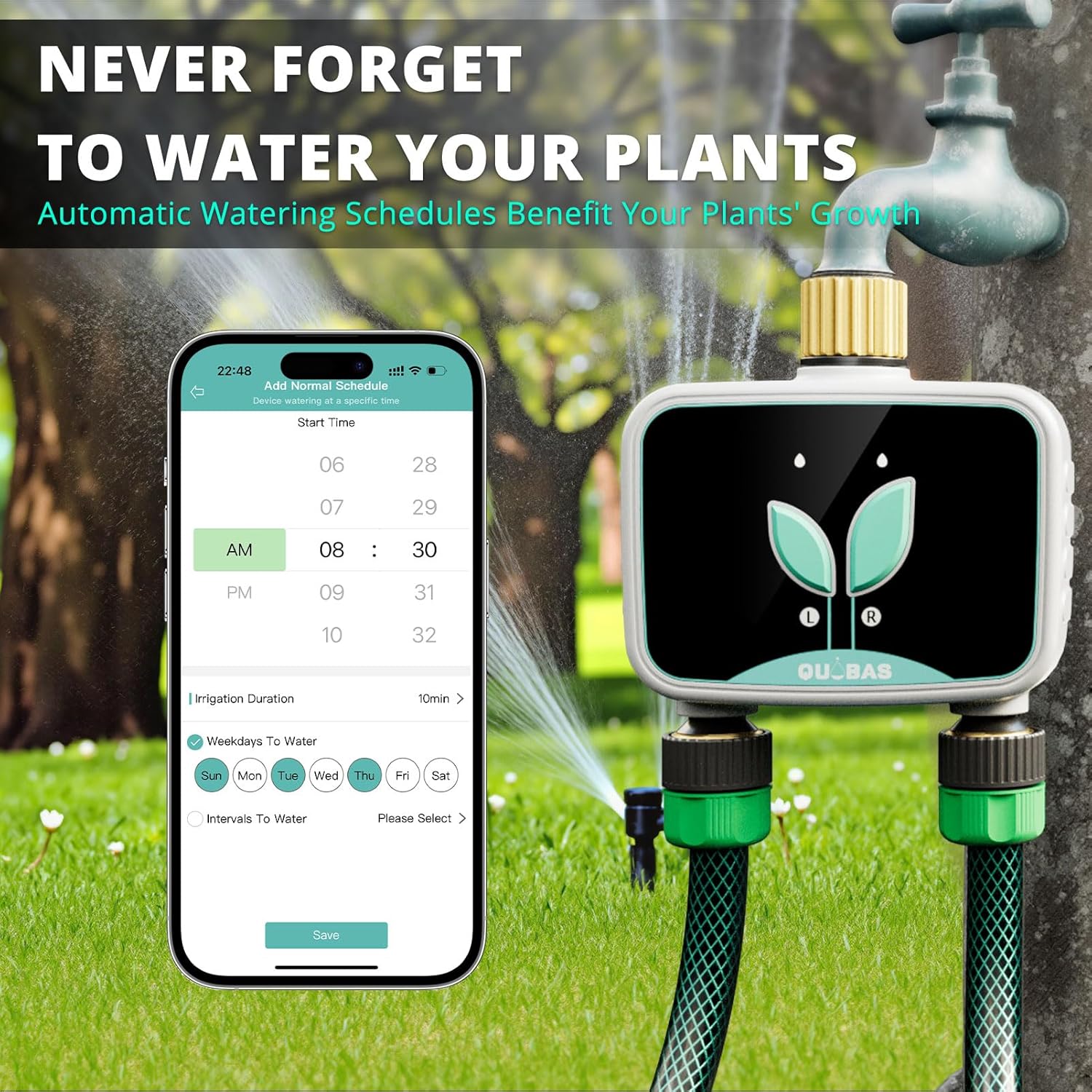QUOBAS WiFi Sprinkler Timer with Brass Inlet & Outlet, 2-Zone Smart Water Timer for Garden Hose with APP Remote Control, Manual Watering, Rain Delay Watering, for Lawn, Garden