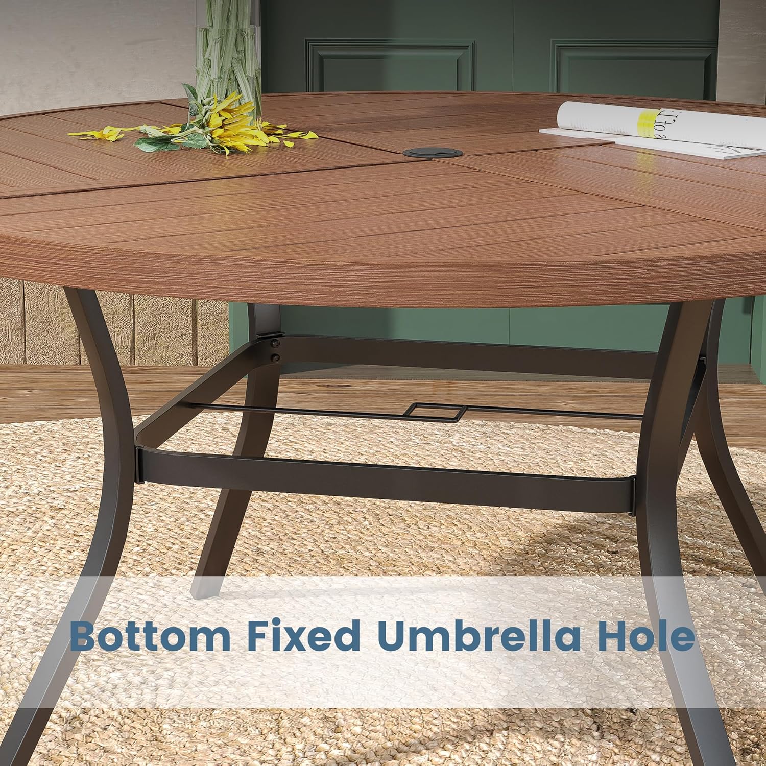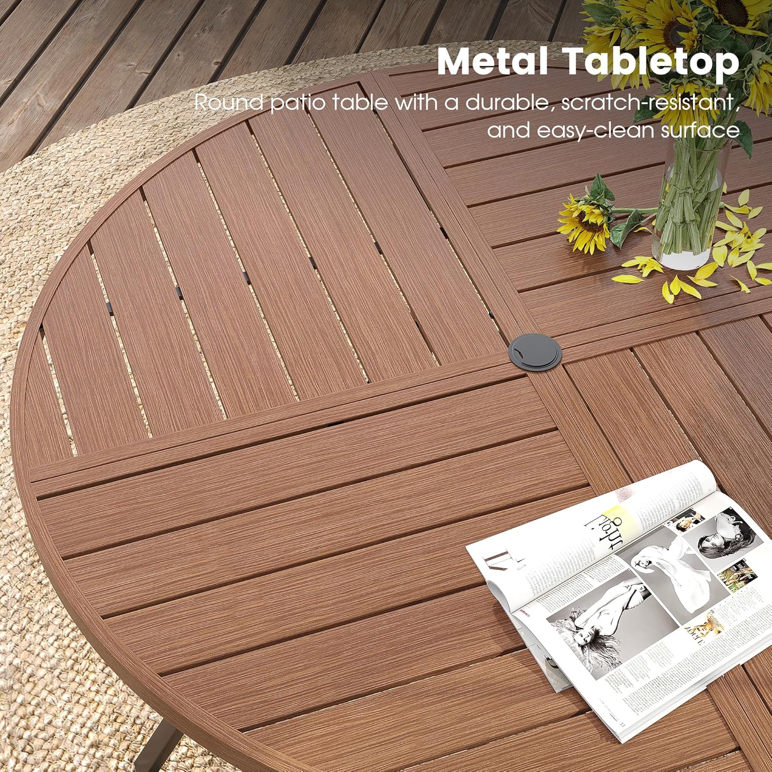 DIFY 50" Round Outdoor Patio Dining Table for 6, All-Weather Metal Steel Slatted Patio Table with 1.57" Adjustable Umbrella Hole, for Lawn Garden Porch Backyard, Walnut
