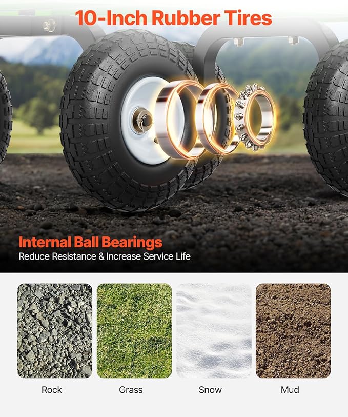 - 360° Rotating Wheels: Equipped with 10-inch rubber tires and metal hubs, the wheels of this heavy duty steel garden cart ensure smooth movement across various terrains, including grass, mud, rocks, and snow. Its sturdy design provides stability while reducing the effort required for transport.