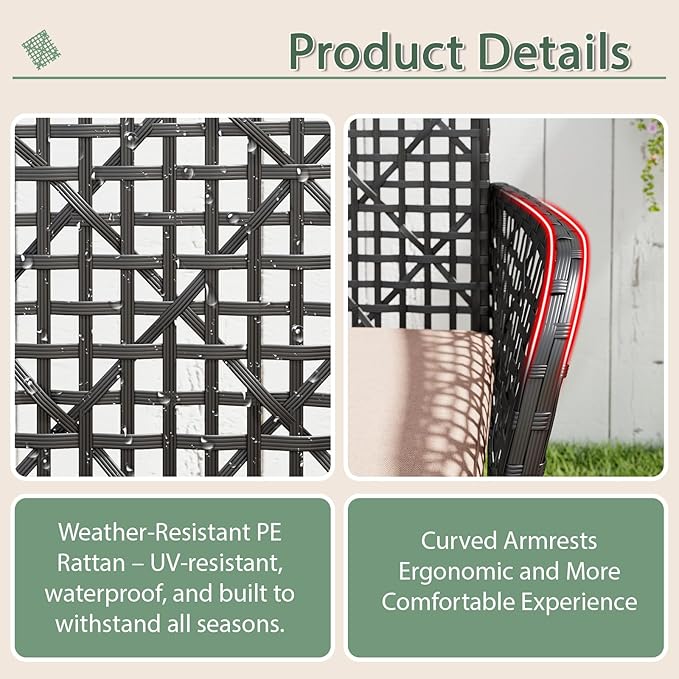- 【Weather-Resistant & Durable Materials】:Constructed with high-quality, weather-resistant rattan and sturdy steel frames, this furniture set is built to endure the elements. Ideal for all-season use in your porch, garden, lawn, or patio.