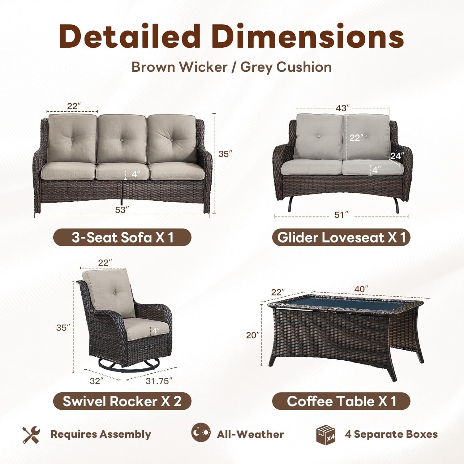- 5-Piece Outdoor Patio Furniture Set – This patio furniture set includes a loveseat glider, two swivel rocker chairs, a sofa, and a multifunctional coffee table with storage for the Belord ottoman. Perfect for patios, porches, and backyards, it combines relaxation and style for any outdoor setting.