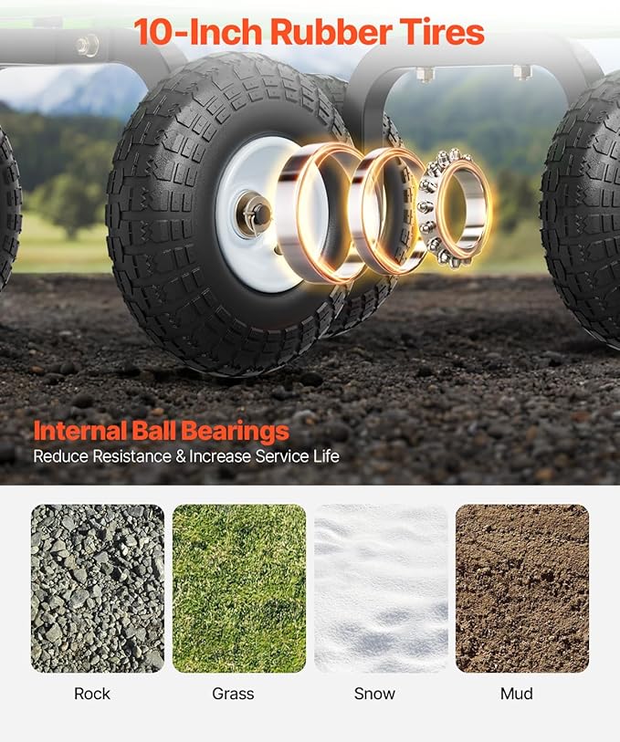 - 360° Rotating Wheels: Equipped with 10-inch rubber tires and metal hubs, the wheels of this heavy duty steel garden cart ensure smooth movement across various terrains, including grass, mud, rocks, and snow. Its sturdy design provides stability while reducing the effort required for transport.