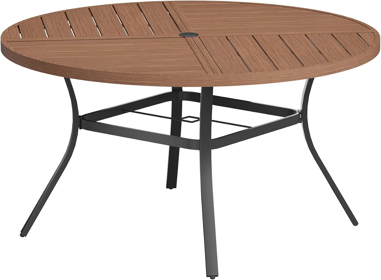 VICLLAX Round Patio Table with Adjustable Umbrella Hole for 6, All Weather Metal Outdoor Dining Table for Lawn Garden, 50" Outdoor Coffee Table, Walnut Wood-Like Tabletop