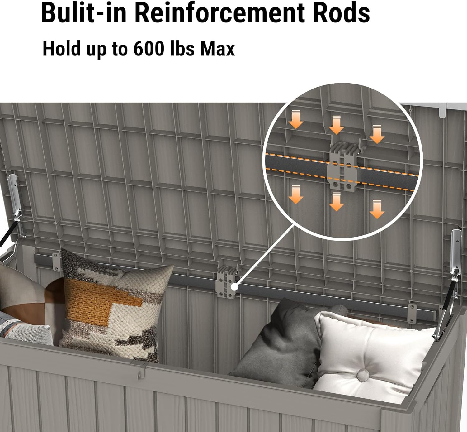 - 【Sturdy & Reinforced Structure】- Built for stability and strength, this deck box incorporates metal reinforcement rods boosting its structural integrity by 30%, not only prevents deformation but also allows the lid to support a remarkable weight capacity of up to 600 lbs, making it suitable for use as an additional bench or seating option