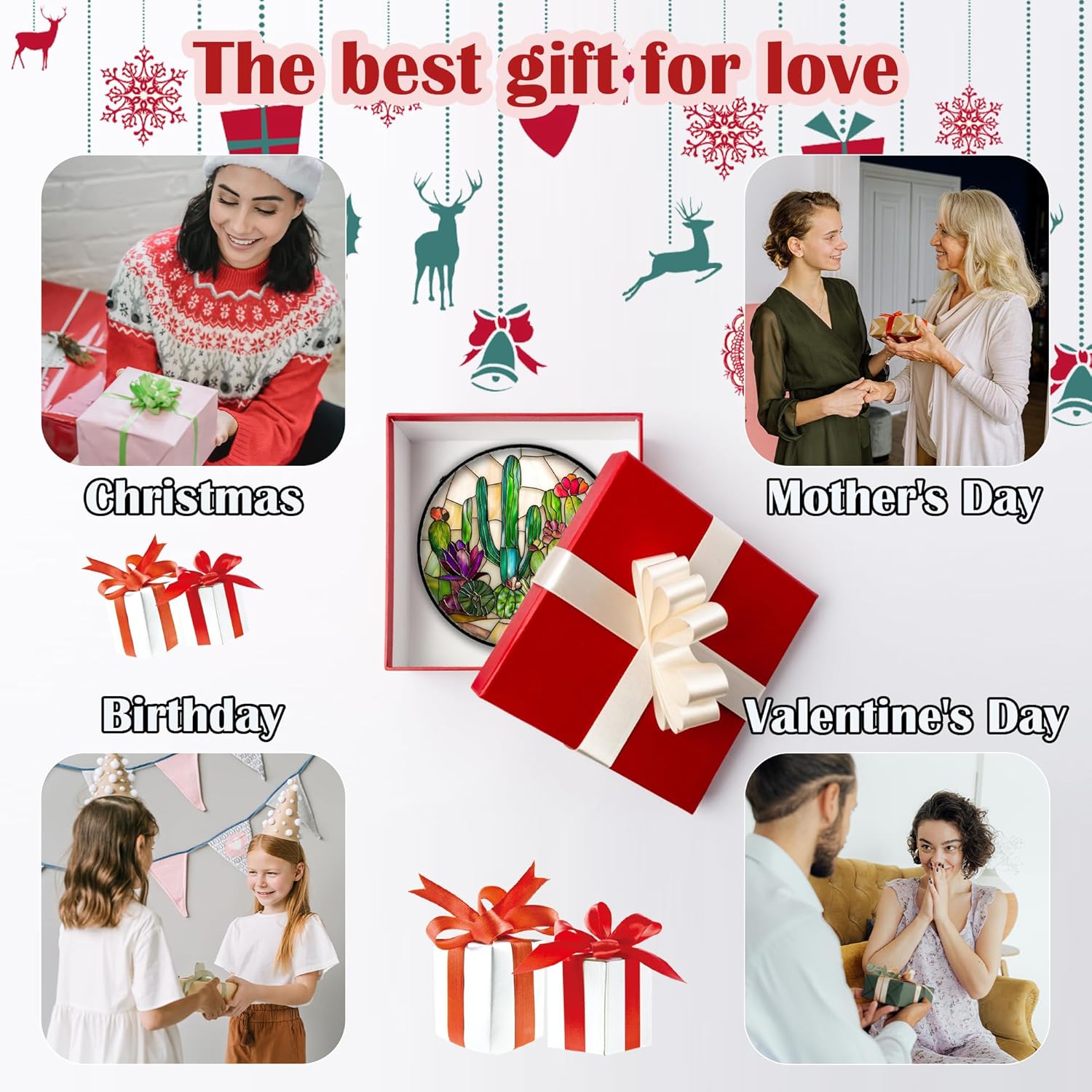 Stained Glass Window Hanging, White Green Cactus Suncatcher Diamond Glass Panel Hangings Sun Catchers Decor for Birthday for Women, Men, Wife, Aunt, and Mom 7.8 in