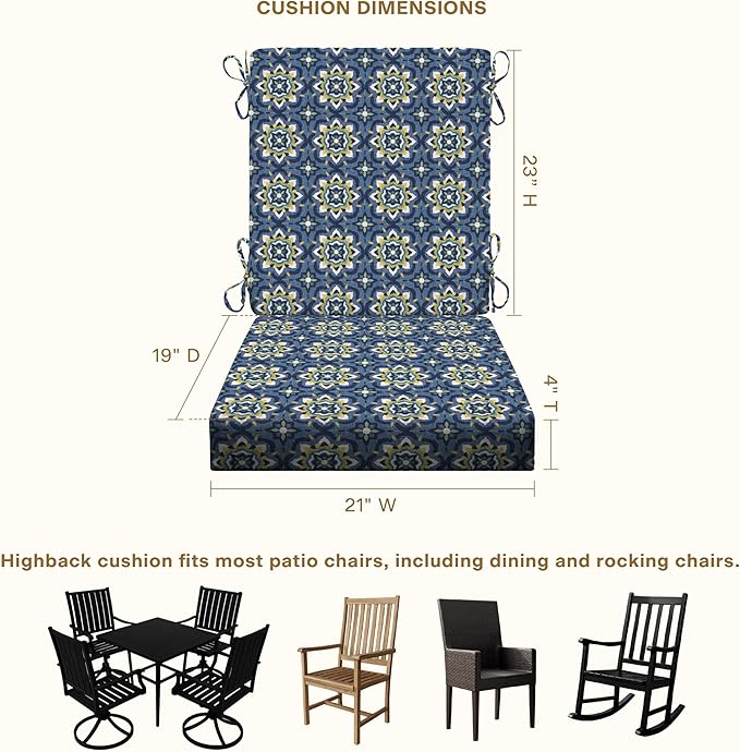 - Effortless Care – Keep your outdoor living space looking guest-ready all season long with our low-maintenance dining chair cushion for patio furniture. Easily spot clean using a rag, soap, and warm water. Hang cushion and let air dry for best result.