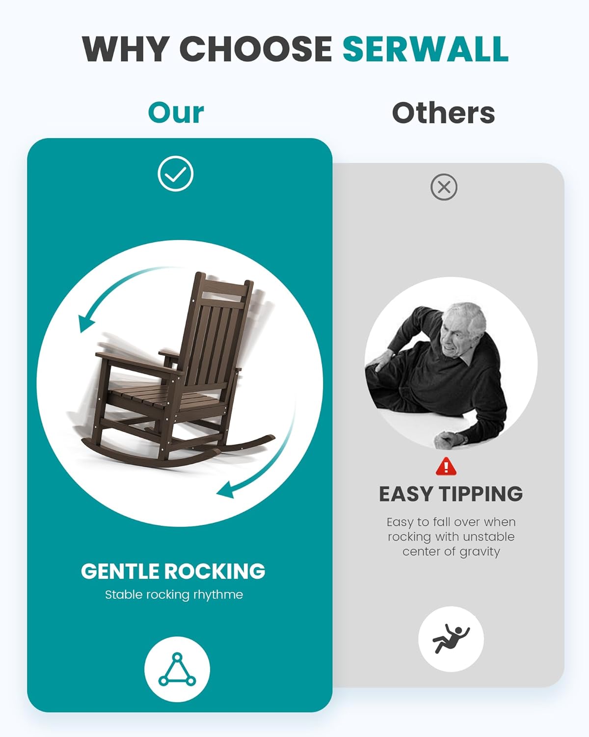- Anti-Rollover: Engineered for stability, our outside rocking chair boasts a 4-point design with crossbars that evenly distribute weight, coupled with a precision-calculated rocking arc for safe, relaxing use.