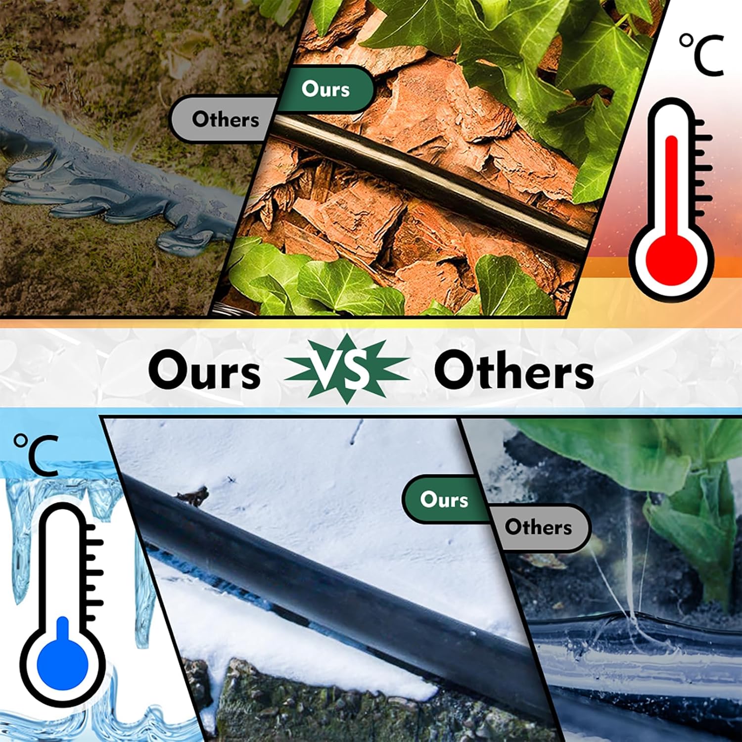 - 【Ultra-Durable 1/4" Drip Tubing for Year-Round Use】Crafted with 3mm thick polyethylene walls (4mm inner/7mm outer diameter), this heavy-duty tubing resists kinking and bursting. Withstands extreme temperatures -4°F to 158°F – bury underground, expose to sun, or bend around tight garden curves without cracking.