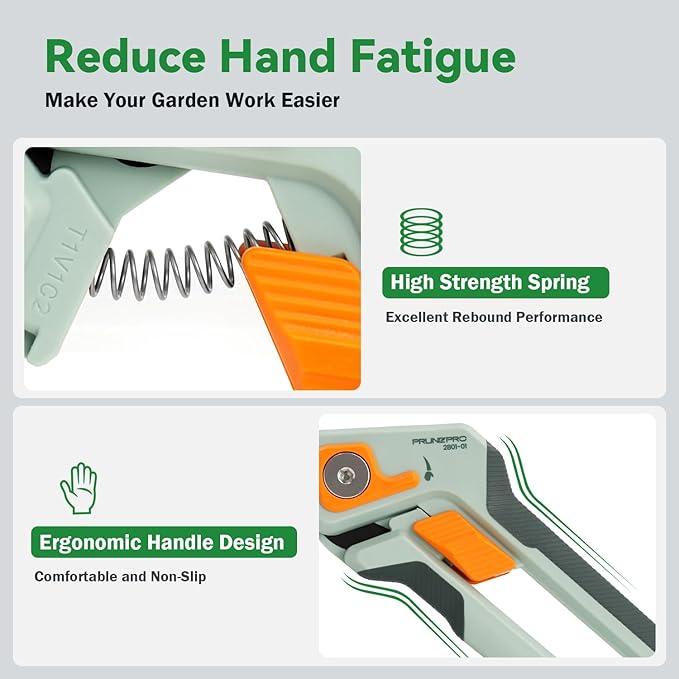 - 【Your Professional Pruning Tool】The Teflon coating enhances sharpness and rust resistance, making every cut easy and clean. Our garden scissors are hassle-free to clean and maintain, requiring minimal care to ensure long-lasting performance and sharpness. Makes PrunePro garden shear a reliable choice for all your gardening needs