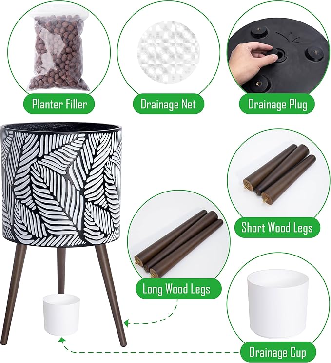 - What’s included: planter pot with drainage hole, drainage plug, set of 2 stand (3 long wooden legs & 3 short wooden legs).