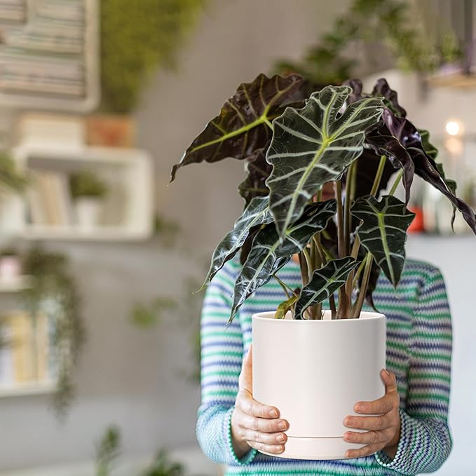 - Simple, elegant, and modern cylindrical straight round planter pot with saucer and drainage hole.