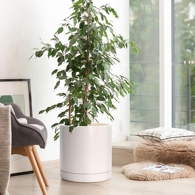 - Simple, elegant, and modern cylindrical straight round planter pot with saucer and drainage hole.