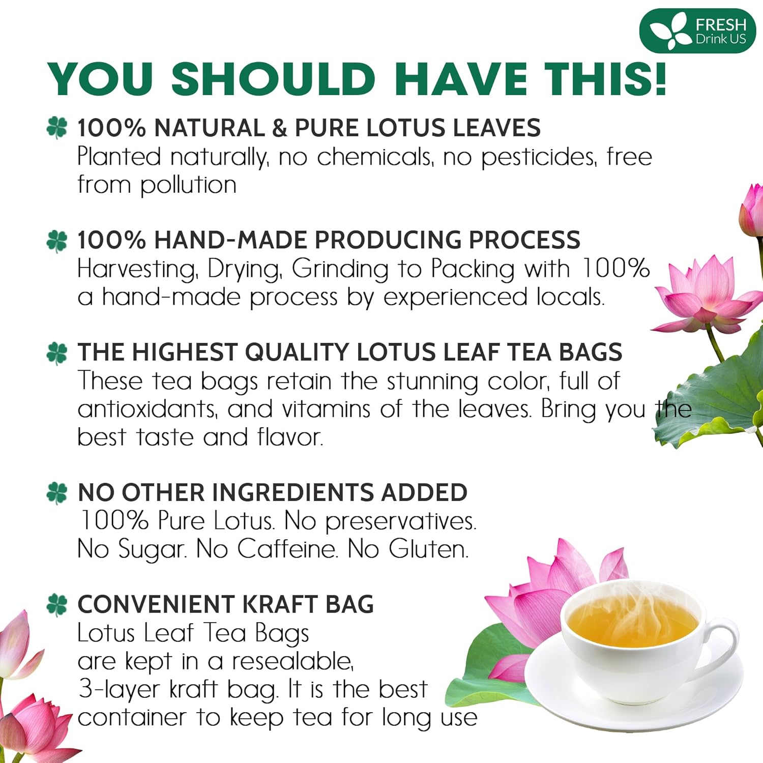 FreshDrinkUS, Premium 75 Lotus Leaf Tea Bags, 100% Natural & Pure from Lotus Leaves. Loose Leaf Lotus Herbal Tea. Made with Eco-Conscious Tea Bags. No Sugar, No Caffeine, No Gluten, Vegan.