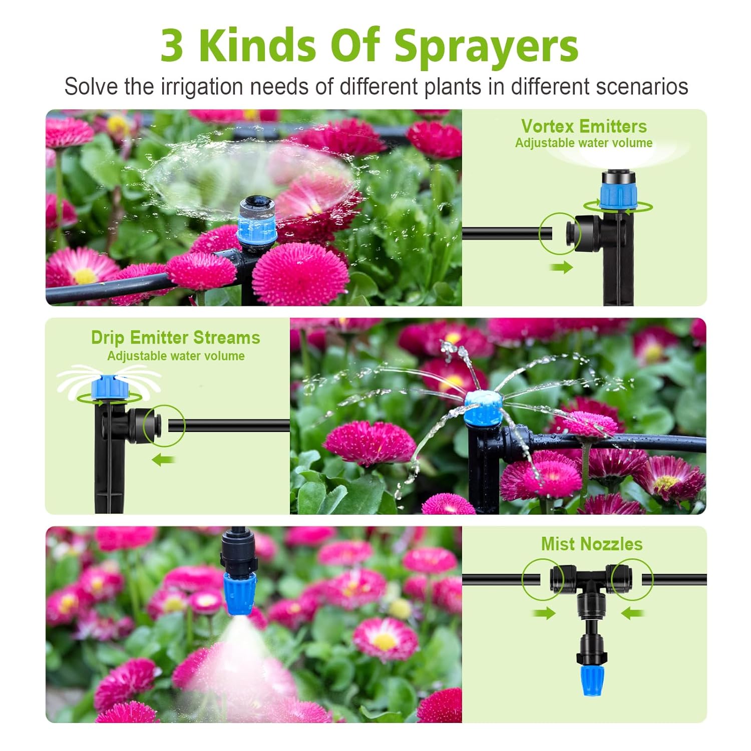 - COMPREHENSIVE DRIP IRRIGATION KIT: Kafuzi drip irrigation system comes with a variety of components to meet all the watering needs of your garden, including 197ft of 1/4'' irrigation pipe, 33ft of 1/2'' irrigation pipe, 1/2'' locking barb 6-way connector, drip sprinkler stream, vortex sprinkler, blue mist sprinkler, quick connect tee, faucet connector and other basic parts