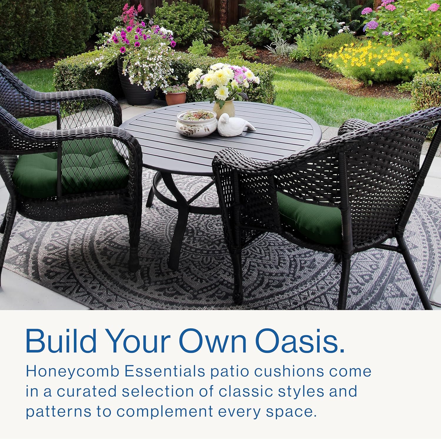 - Classic Design - Elevate your outdoor furniture in quality and style at a price that fits your budget. Honeycomb Essential cushions are a curated selection of our classic styles paired with fresh patterns designed to complement any space.
