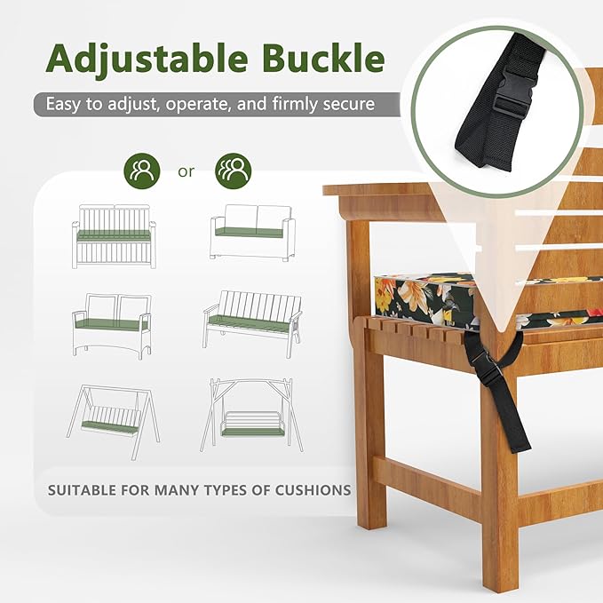 - 【Stationarity】The adjustable buckles of swing bench cushion cover securely hold the bench cushion in place, preventing it from sliding off. Buckles are designed for flexibility, allowing you to easily adjust the tightness as needed, ensuring your sofa seat cushions stay in the ideal position.