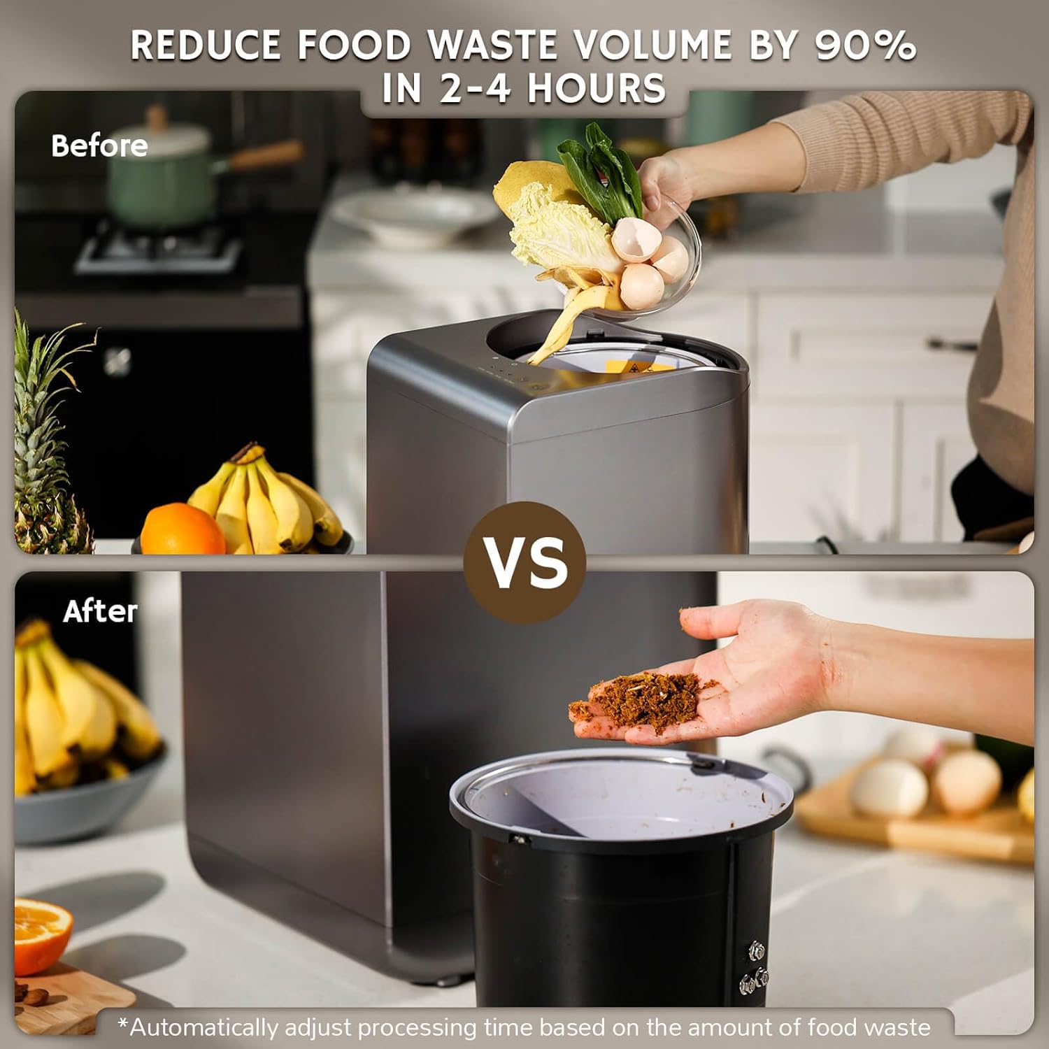- RAPID COMPOSTING: Transforms kitchen waste into nutrient-rich soil material in hours, reducing waste volume by up to 90% through efficient processing