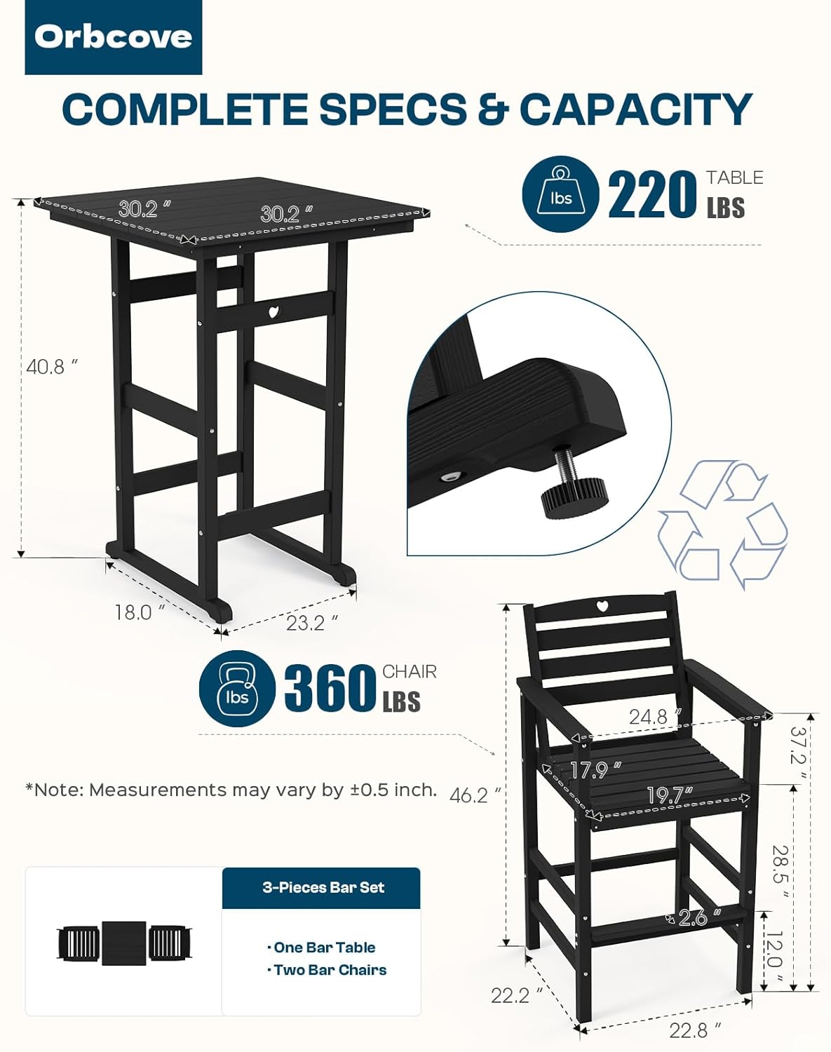 - Durable All-Weather Design: (Please note!!!Your order consists of two separate packages, which may be delivered at different times.) Crafted from HDPE with a natural wood grain finish, Orbcove bar table and chairs set withstands sun, rain, and wind without fading or cracking. Ideal for deck furniture, backyard furniture, or porch furniture, it’s perfect for year-round outdoor living.