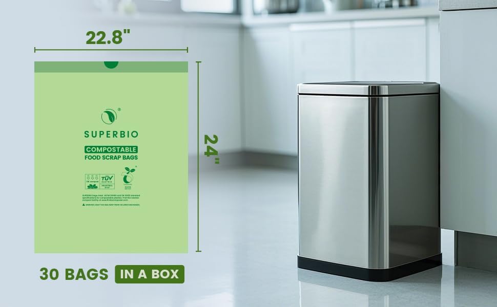 - Product Information: SUPERBIO Compostable Drawstring bags, 8 gallon (30.3L) 22.8 in x 24 in x 1 mil, 30 bags per roll, tear free design is convenient