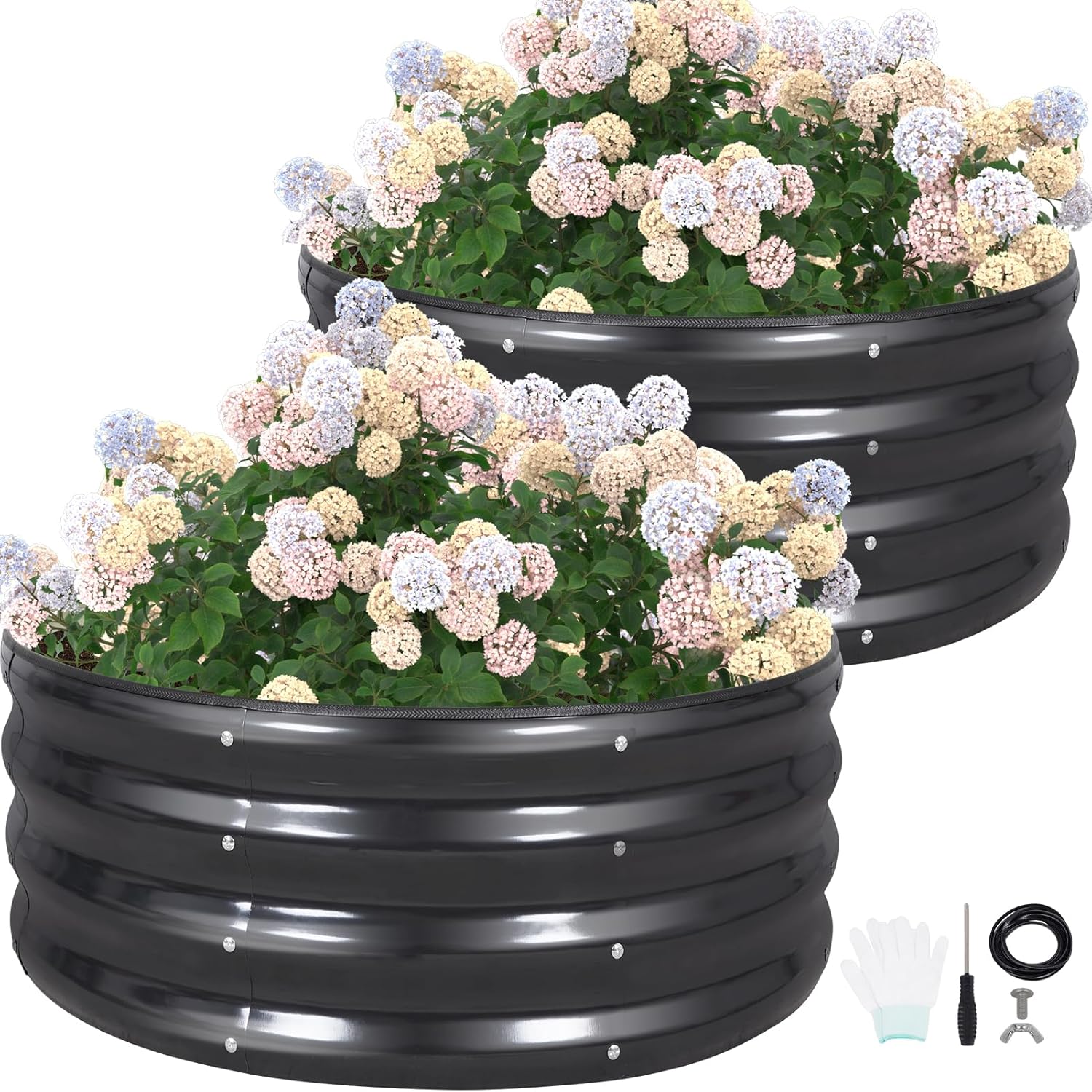 G GOOD GAIN Round Raised Garden Bed - 2Pcs 3x3x1ft Galvanized Steel Planter Boxes Outdoor with Rubber Edge Trim | Metal Raised Beds for Gardening Vegetables Flowers Fruits Herbs (Dark Grey)