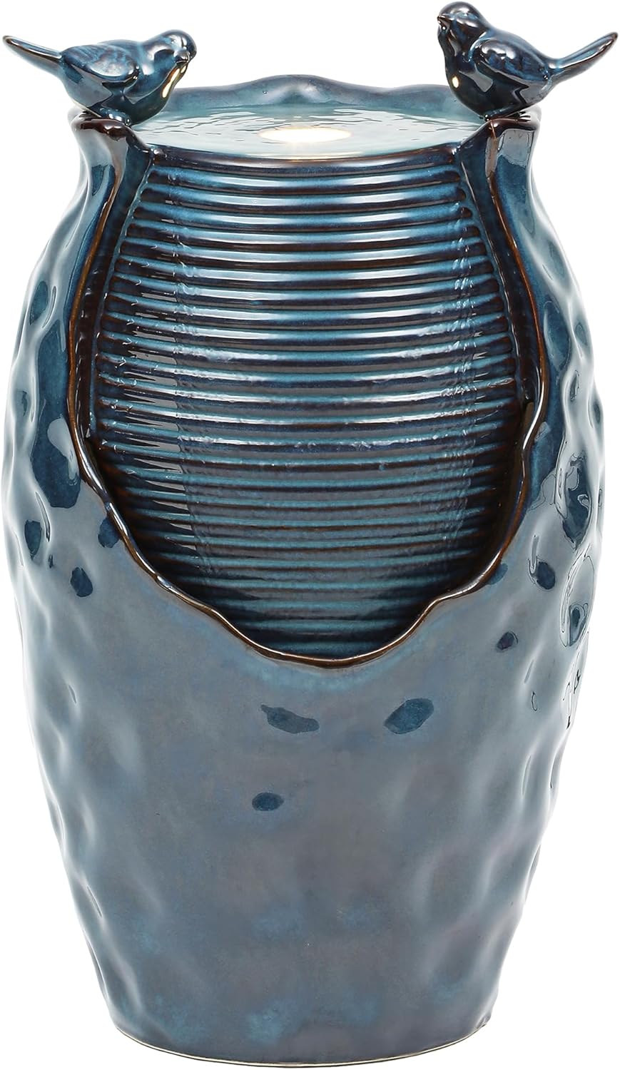 24.8" H Ceramic Jar Outdoor Water Fountain with LED Lights & Bird Accents, Elegant Turquoise Glaze with Bubble-Like Texture, Decorative Garden Water Feature