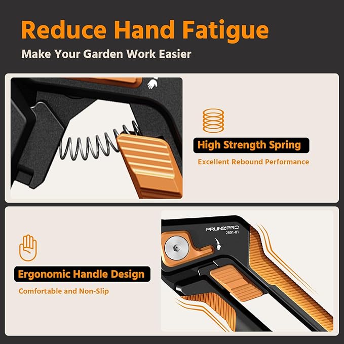 - 【Your Professional Pruning Tool】The Teflon coating enhances sharpness and rust resistance, making every cut easy and clean. Our garden scissors are hassle-free to clean and maintain, requiring minimal care to ensure long-lasting performance and sharpness. Makes PrunePro garden shear a reliable choice for all your gardening needs