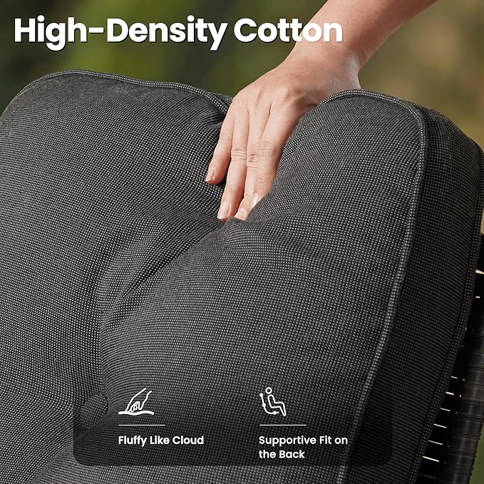 - Comfy Thick Cushion: Made of all-weather high-density waterproof coating fabric and upgraded thickened cushions, it has high resilience, good breathability, wear resistance and tear resistance. The cushion cover is zippered and can be removed for washing, and simple and convenient daily maintenance