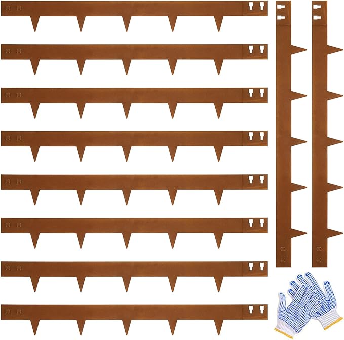 - [ Corten Steel Landscape Edging] - Material: Corten Steel, Size: 40" L x 5" W ( include the spikes), the height of the spikes is 2 inch, and the part above the ground is 3 inch. Quantity: 10 Packs,After install, 10 pieces total 33.4 feet in length