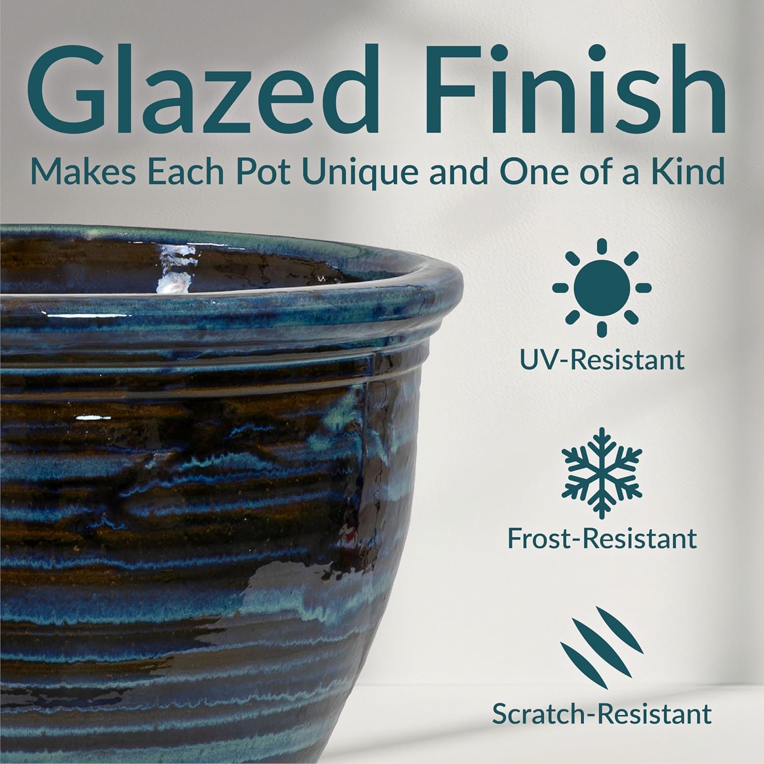 - DESIGNED FOR BEAUTY AND DURABILITY: This outdoor plant pot is crafted with a rich, hand-painted glazed finish that is kiln-fired for a classic, shining appearance. Subtle variations in color highlight the artisanal glazing process, making each piece truly unique. The durable ceramic construction offers natural UV and frost resistance, while its heavy weight adds stability to outdoor arrangements, keeping the planter upright in windy conditions.