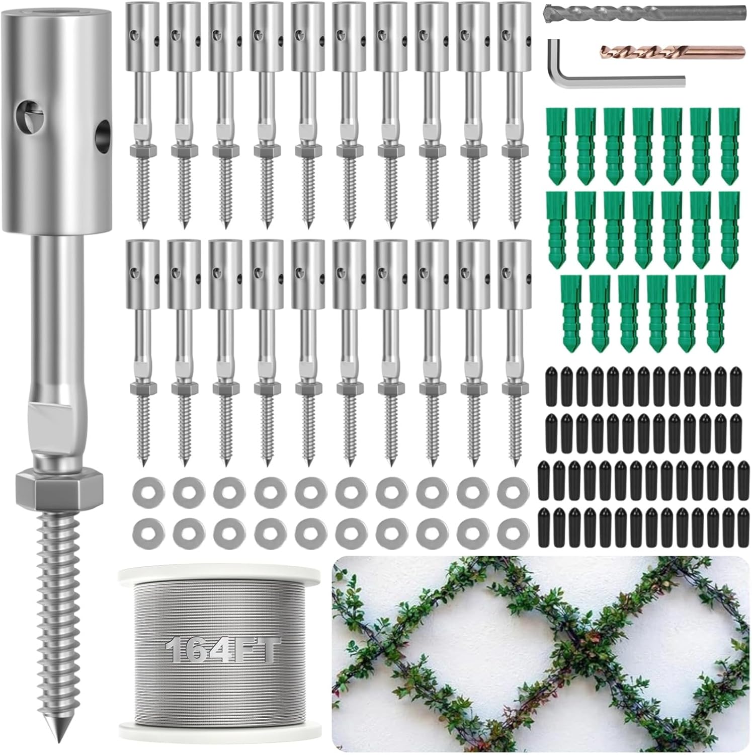 Trellis Wire for Climbing Plants Outdoor, 20 Set Wall Wire Trellis Kit with 1/8" x 164ft Stainless Steel Cable, T316 Espalier System Cable Trellis Kit with Adjustable Spacing Vines Green Wall
